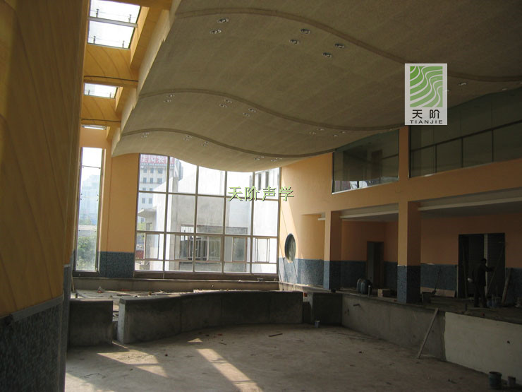 上海大學游泳館工程使用了1200方的木絲吸音板,安裝在天花,不僅美觀。對各種頻段的吸聲效果的很明顯,可以有效避免回聲。