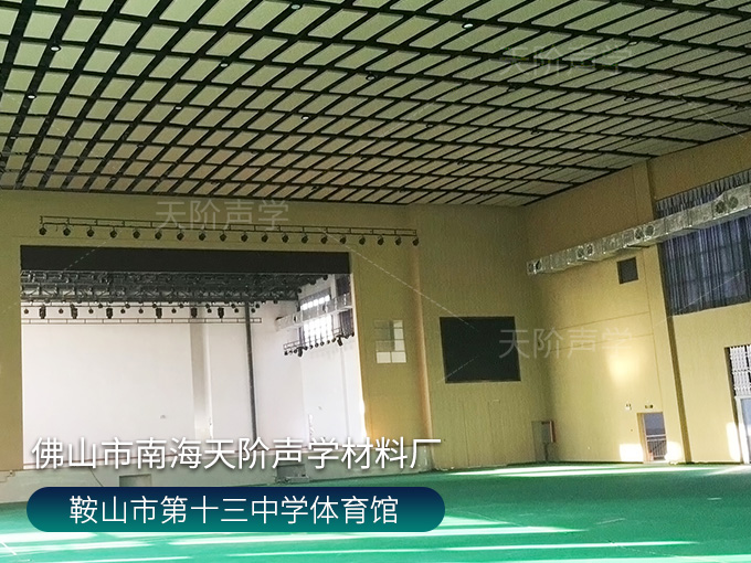 鞍山市第十三中學(xué)體育館,墻面使用槽木吸音板,基材選用不燃堅(jiān)硬的玻鎂基材,飾面選用活力青春的色調(diào)。條形開(kāi)槽吸音板,吸音效果顯著,能吸收活動(dòng)期間的噪音,回聲。