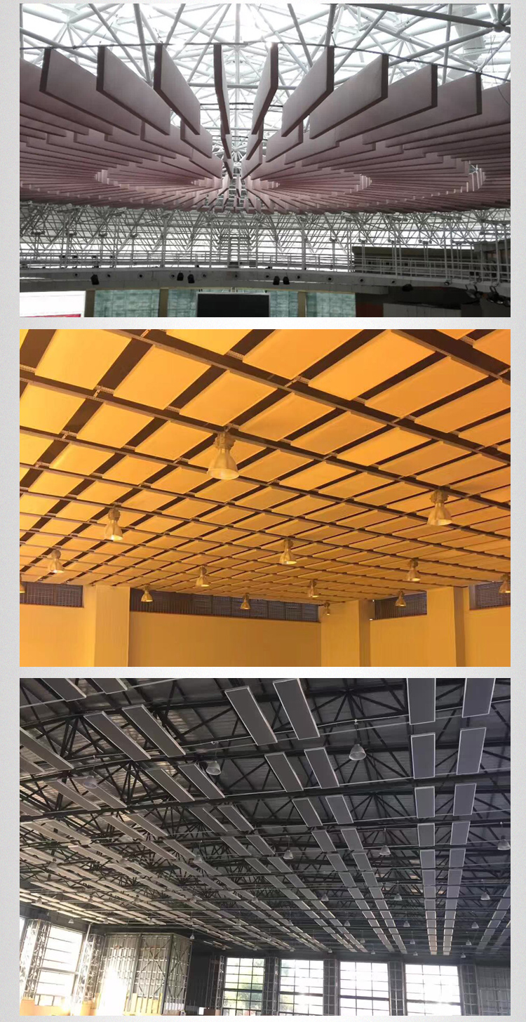 果基本相同。水平懸掛板狀空間吸聲體的離頂高度一般為房間凈高的1/5至1/7左右,一般來說,考慮到施工的難易程度,空間吸聲體懸掛在建筑頂部的鋼架以下,其高度剛好會在