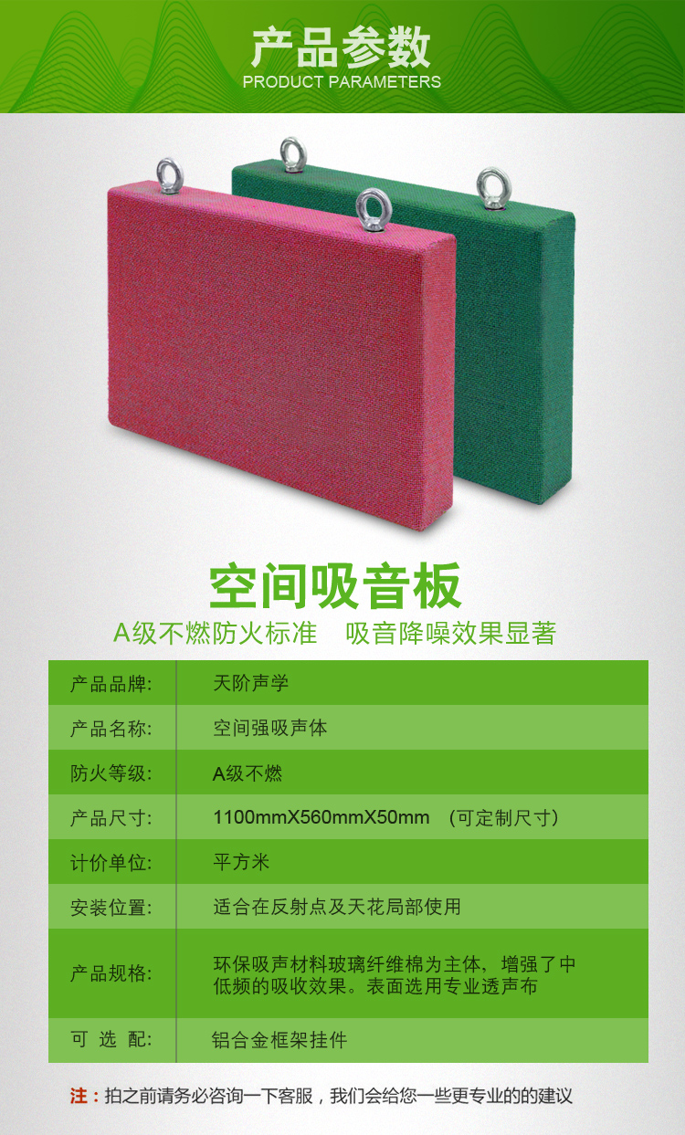 房間凈高的1/5至1/7左右,達到吸聲及裝飾的要求;若條件允許,可掛得更低些,離聲源近些。為了提高懸掛空間吸聲體的建筑裝修效果,應對空間吸聲體的形式、色彩、懸掛方