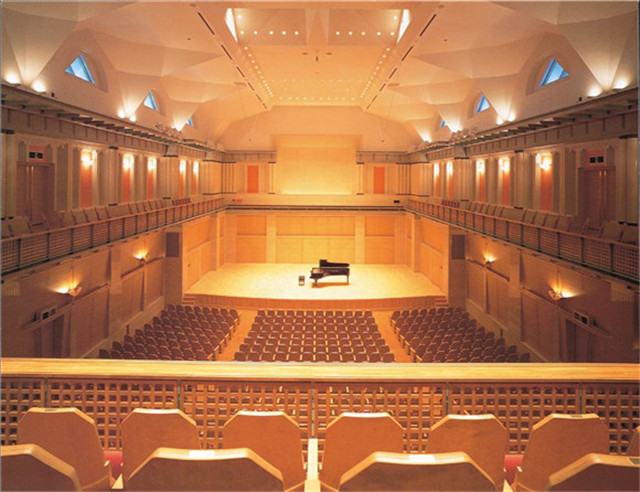 例如,在打開窗戶的那一面,由于完全不反射它所碰到的聲音能源,因而吸音率為100%,亦即該面為完全吸音面,但同時也可能有完全無法隔音的面存在。室內之吸音程度大時,即能壓制室內的擴散音并降低噪音水平。此方法系遠離噪音源和影響點時會有效果,但若室內各處都有噪音源且和影響點之距離相近時,例如窗邊的座位對由窗戶入侵的聲音,因為噪音的直接影響太大,故而其藉由吸音所產生的隔音效果不會太顯著。音樂廳聲學設計的指標一流的具有高雅文化氛圍的專業性音樂廳可供自然聲演出,并適應多種風格的音樂作品演出。
