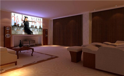 一般建議采用簡潔處理,在處理好吊頂骨架的強度的情況下,特別是處理好音箱吊掛位的強度,并要作好記號,頂部采用石膏板,四周采用石膏成型模塊,周遍采用輕巧的木制幾何結(jié)構(gòu)襯底就可以了。這樣可以配合暗藏的三基色彩燈,相成光折射組合。