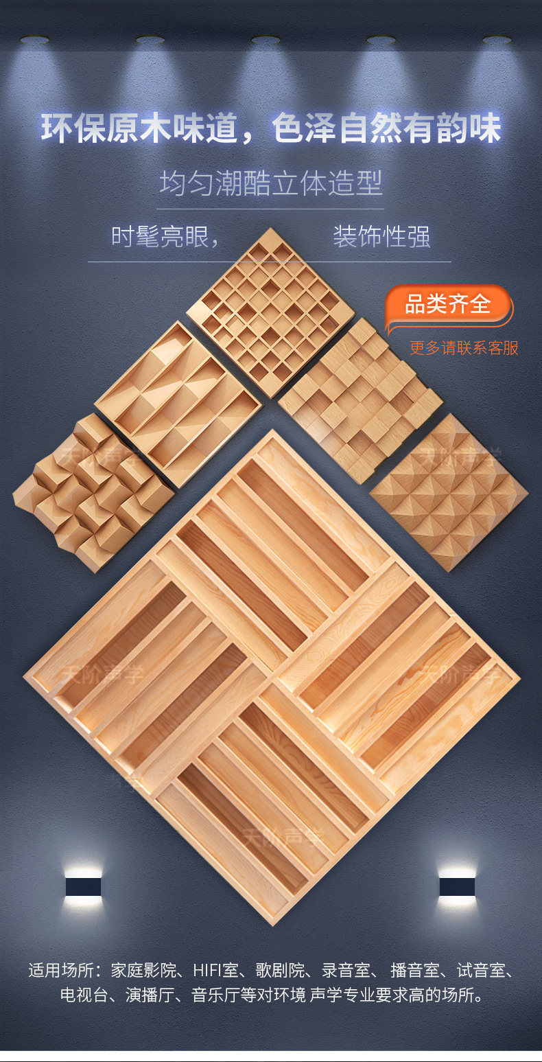 4.除了具有平面吸音板的所有功能以外,還能通過它的立體表面對聲波進行不同角度的傳導,消除音波在擴散過程中的盲區,改善音質,消薄重音,削弱高音,對低音進行補償。